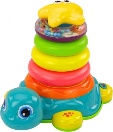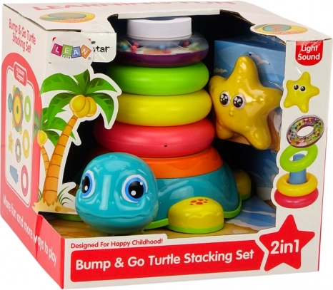 Piramida Vozeča želva 2v1 je dinamična igrača, ki združuje zabavo in učenje. Osnova v obliki vozeče želve se odziva na ovire ter ponuja svetlobne in zvočne učinke, kar igro naredi še bolj interaktivno.