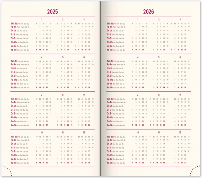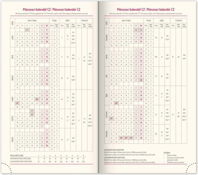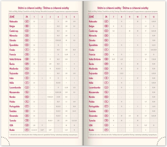 - Tedenski razpored s češko-slovaškim koledarjem in dodatnimi jeziki.