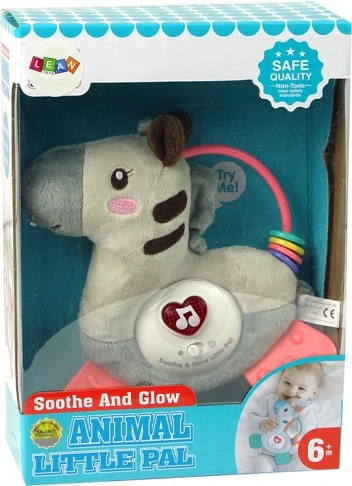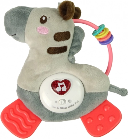 Interaktivna zebra iz mehkega pliša prinaša otrokom zabavo in umiritev. Svetleče srček sproži melodije in pritegne pozornost, medtem ko mehka grizala na nogicah lajšajo izraščanje zobkov. Štirje barvni obročki na hrbtu delujejo kot ropotuljica in razvijajo sposobnosti prijema ter manipulacije.