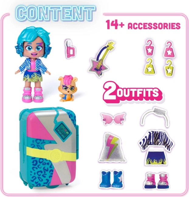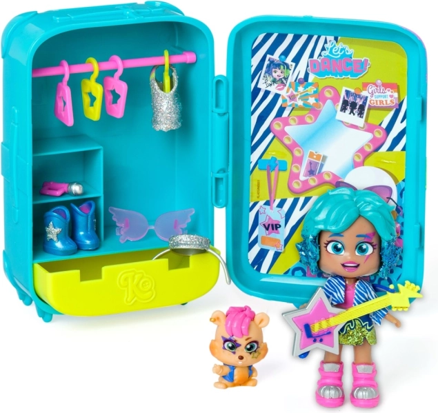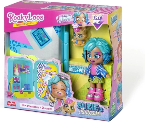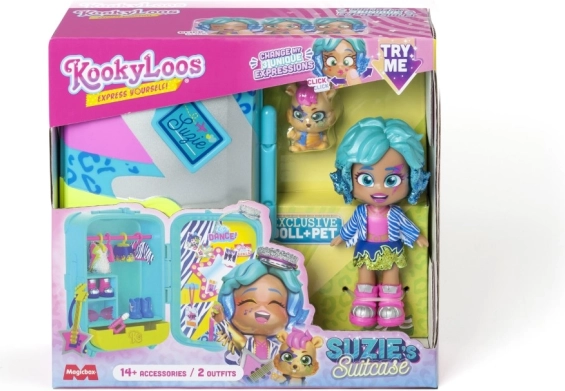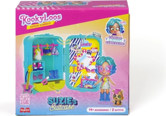 Ste pripravljeni na pot? Kovček KookyLoos vsebuje vse, kar potrebujete za odlično zabavo. Čakajo vas kar 4 modeli za zbiranje! Suzi je prava poznavalka mode. Njena oblačila haute couture so najnovejši pariški modni slog! Ste pripravljeni na ogled draguljarne na trgu Place Vendôme in Rue Chambon? Vi pa odločite, kateri od dveh outfitov bo oblekla za najnovejšo modno revijo! Ima tudi tri različne izraze na obrazu, ki jih lahko spremenite z enim klikom. Vse lahko pospravite v kovček in vzamete s seboj! Kovček vsebuje – ekskluzivno punčko KookyLoos, 2× oblačilo, 1× živalco, več kot 13 dodatkov in obešalnike.
