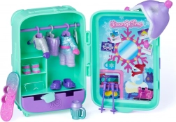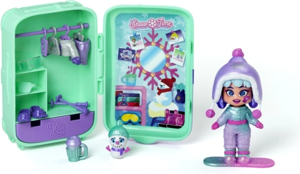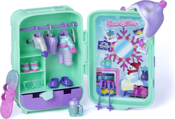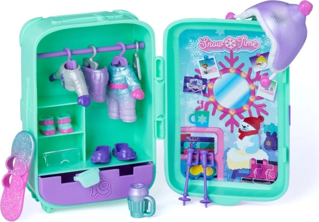 Kovček služi kot mini omarica in shranjevalni prostor, zato imate vse outfite, živalco in dodatke lepo skupaj. Dve zimski kombinaciji oblačil, deska in tematski dodatki spodbujajo domišljijo in fino motoriko.