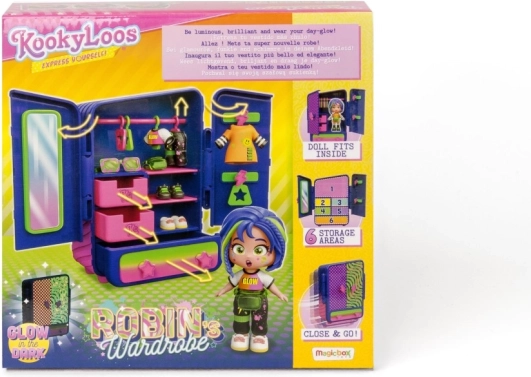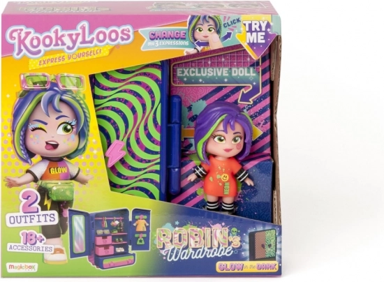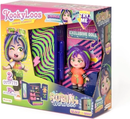 Odkrijte svet ustvarjalnosti z lutko KookyLoos Robin. Ta posebna lutka omogoča spremembo izraza obraza z le enim klikom, kar spodbuja otroško domišljijo in igro. V paketu boste našli: