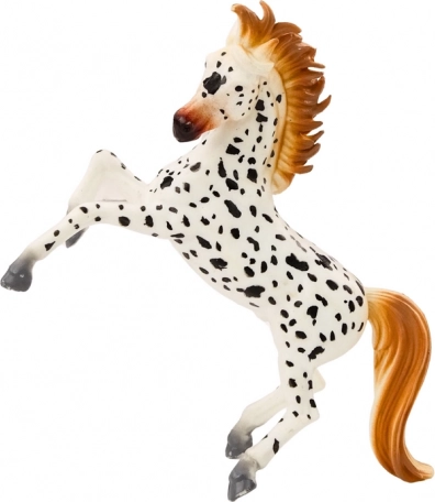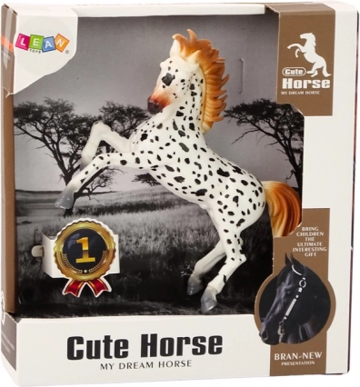 Ta skrbno izdelana figurica konja izstopa po realističnih detajlih – bela barva s stilskimi pikami, rjava griva in rep ter izrazita poza, ko konj stoji na dveh nogah. Ustvarja vtis gibanja in vsaki otroški kmetiji ali hlevu doda avtentično vzdušje.