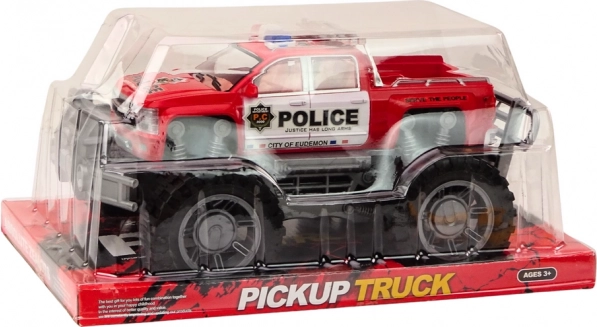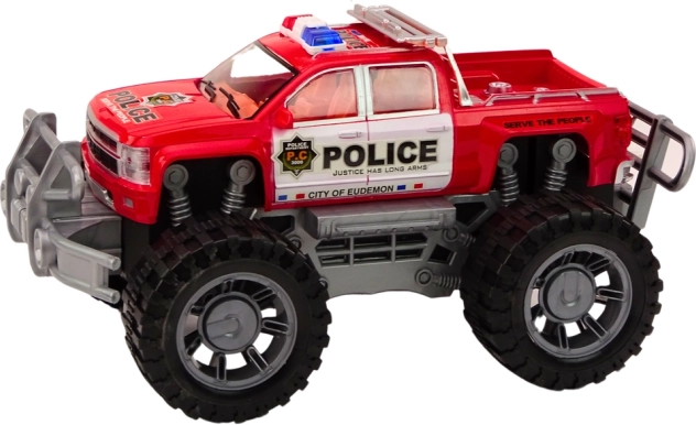 Rdeči policijski terenski pickup z vztrajnikom, velika kolesa, realistične podrobnosti POLICE. Robustni model, primeren od 3 let, certifikat CE, EN 71.
