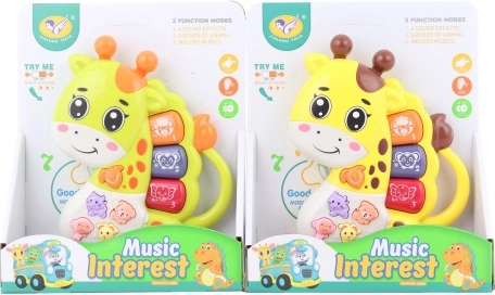 Plastični klavir v obliki žirafe. Predvaja glasbo in oddaja zvoke živali. Napajanje z 2 baterijama AAA (vključeni v paket). Približne dimenzije klavirja: 12 × 16 cm. Približne dimenzije embalaže: 16 × 19 × 5 cm. Starost 12m+