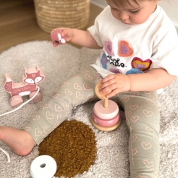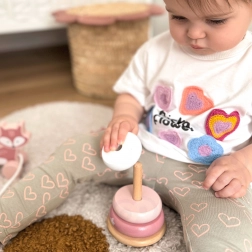 Naravna lesena izdelava z gladkimi robovi in pomirjujočimi rožnatimi odtenki je prijetna na dotik in vabi k vsakodnevni igri.