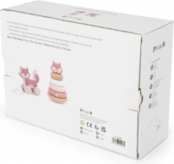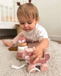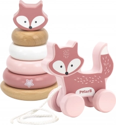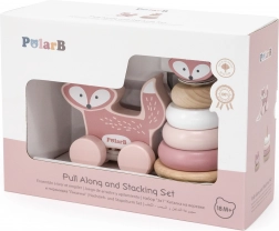 V tem kompletu sta dve priljubljeni igrači: stolp za zlaganje z motivom lisice, ki otroke uči razporejati obroče po velikosti in barvah, ter vlečna lisica na vrvici, ki spodbuja hojo in razigrano gibanje. Kombinacija obeh podpira naravno učenje skozi igro.
