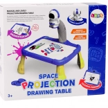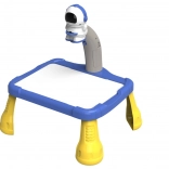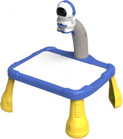 Projektor je v obliki astronavta in služi za projiciranje slik na papir, kar otrokom omogoča preprosto sledenje in risanje kozmičnih motivov, kot so planeti, zvezde, rakete in astronavti. Mizica je opremljena s stabilnimi rumenimi nogami in modro, prostorno risalno površino.
