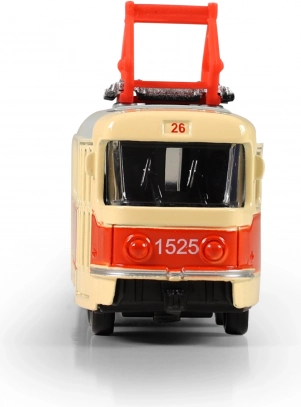 Verodostojna izvedba z okni, kolesi in funkcionalnim pantografom poudari avtentičen videz mestnega tramvaja.