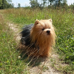 Dolga žametno mehka dlaka, sijoče oči in verna barvna izvedba ustvarjajo prepričljivo realističen videz jorkširja.