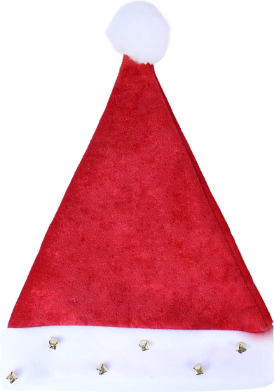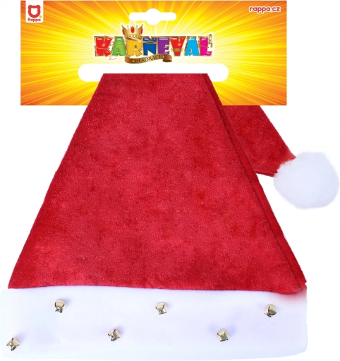 Slogovna božična kapa z belim obrobjem, okrašena z zvončki in cofom. Idealna za božične zabave.