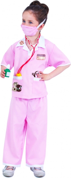 Otroški kostum veterinarka v nežni rožnati barvi s stilskim živalskim potiskom spodbuja domišljijo in ljubezen do živali. Celoten komplet je zasnovan za višino 117–128 cm in je primeren za pust, maškarado in igro doma.