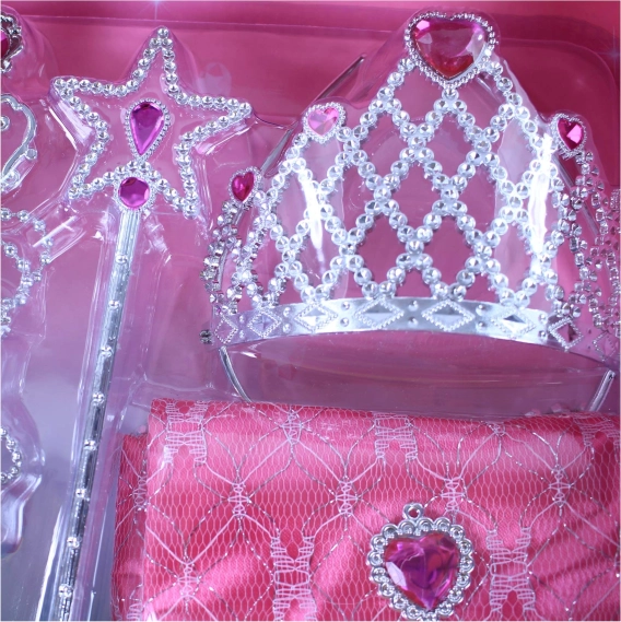 Razsvetlite otroško domišljijo s čarobnim princeskinim kompletom, ki vsako deklico spremeni v pravo princeso. V paketu so krona, uhani, ogrlica, čarobna paličica in torbica v čudoviti rožnati barvi – idealno za preobleke, pust in igre doma.