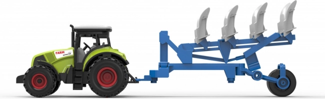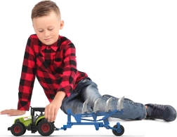 Vožnjo omogoča vztrajnik, zato se traktor zlahka zažene z nežnim potiskom. Skupna dolžina kompleta je 37 cm, kar zagotavlja stabilnost in enostavno upravljanje z majhnimi otroškimi rokami. Baterije so priložene, zato se lahko otroci začnejo igrati takoj po razpakiranju.