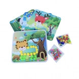 Odkrijte igriv komplet, ki spodbuja ustvarjalnost in potrpežljivost. Otroci razporejajo barvne gumbe v podlago po predlogah z živalmi ali po lastni domišljiji. Zahvaljujoč dvema velikostma gumbov je sestavljanje zabavno in raznoliko.