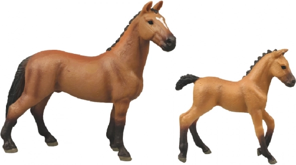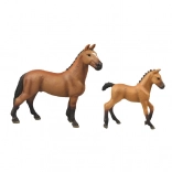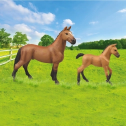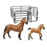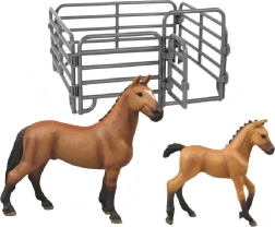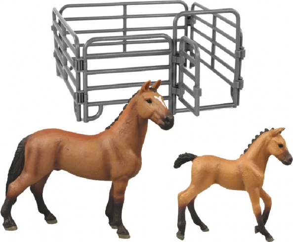 Idealni set za ljubitelje konjev vsebuje figuro konja in žrebička v privlačni rjavi barvi z belo liso, dopolnjeno z ogrado.