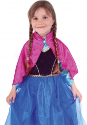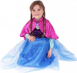 Ta stilski kostum vsako deklico spremeni v pogumno princeso, pripravljeno na zimske dogodivščine. Bogate črno‑modre barve z zlatimi detajli ter rožnat satenast plašč z okrasno sponko ustvarjajo impozanten videz za pust, rojstnodnevno zabavo ali preoblačenje doma.