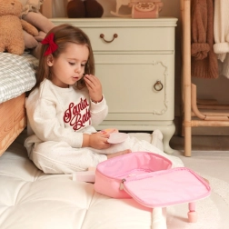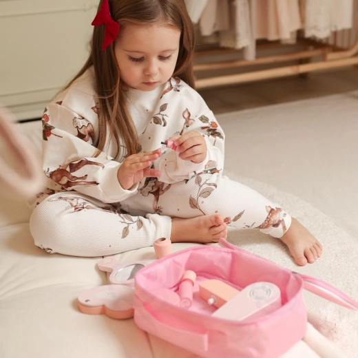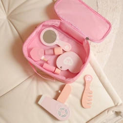 Ta otroški kozmetični set v ljubki rožnati torbici ponuja kar 12 skrbno izdelanih lesenih dodatkov. Otroci se lahko “naličijo”, počešejo in “posušijo” lase ter posnemajo odrasle na način, ki je popolnoma varen in poln domišljije. Zaradi kompaktnih mer je set idealen za dom in potovanja.
