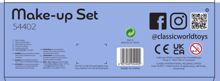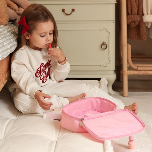 Očarljiv kozmetični set za otroke znamke CLASSIC WORLD prinaša varno in ustvarjalno igro ličenja. V elegantni torbici najdete vse, kar mala modnica potrebuje – od ogledalca do “fen”a. Vsi deli so iz kakovostnega lesa in prebarvani z barvami, varnimi za otroke. Spodbuja domišljijo, razvija fino motoriko in krepi samozavest pri stilskih igrah vlog.