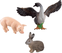 Vsebuje tri realistične plastične figurice: prase, zajček in gos z razprtimi krili, izdelane v naravnih barvah.