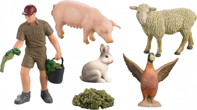 Kmečka igra, polna domišljije: komplet vsebuje kmeta, prašička, ovčko, račko in zajca, dopolnjene z dodatki. Figurice iz kakovostne trde gume imajo realistične podrobnosti in so idealne za kreativno igro na kmetijo.