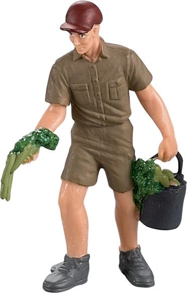 Podrobno izdelana figurica kmeta drži vedro in zelenjavo, da lahko hrani živali in skrbi zanje.