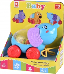 Vlečni slon z kroglicami je igriva živalica na kolescih, ki zabava otroke pri prvih korakih in skupnih igrah. Pri vlečenju ali potiskanju v prozornem delu poskakujejo barvite kroglice, kar otroke naravno motivira k gibanju in raziskovanju.