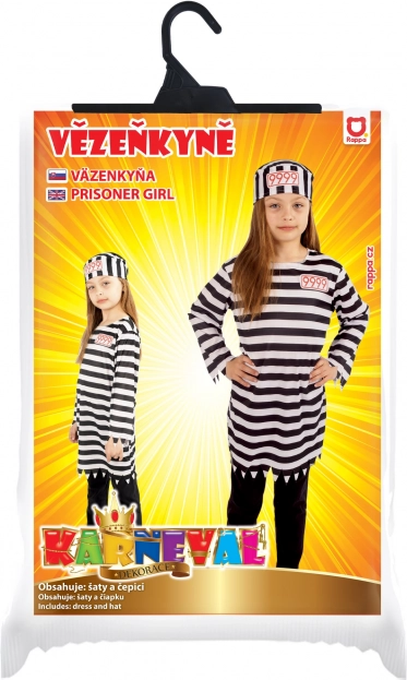 Popestrite vsak karneval s tem učinkovitim kostumom jetnice v značilni belo‑črni izvedbi. Set vsebuje dolgo majico s karakterističnim nazobčanim robom in kapo s številko 9999, ki preobleki dodata avtentičen videz. Primerno za deklice visoke 105–116 cm (pribl. 4–6 let).