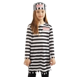 Stajliš črtast kostum jetnice za deklice, stare 4–6 let (105–116 cm), je sestavljen iz dolge majice in kape s številko zapornice. Odličen za karneval, noč čarovnic in maškerado. Enostavno oblačenje in udobno nošenje zaradi lahke tkanine. Klasične belo‑črne črte, avtentična številka 9999 in lahek material za celodnevno zabavo.