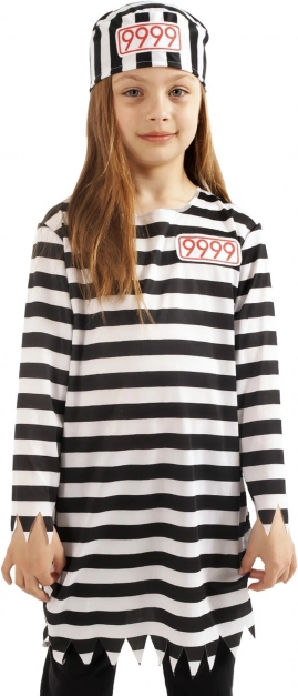 Stajliš črtast kostum zapornice za deklice, stare 6–8 let (117–128 cm), navduši na karnevalu, pustovanju in šolskih prireditvah. Vsebuje dolgo črtasto majico in kapo s številko 9999. Praktična EKO embalaža prihrani prostor in naravo ter je idealna za spletne nakupe.