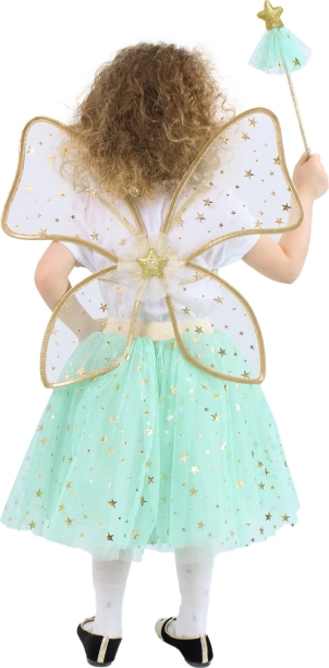 Čudovit set za male vile! Vsebuje zeleno tilno krilo z odtisom zlatih zvezdic, usklajena krila in čarobno palico.
