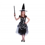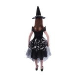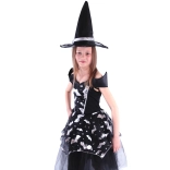 Ta čudovit čarovniški kostum z motivi netopirjev je odlična izbira za deklice, stare 6–8 let, velikosti 117–128 cm. Črna obleka s puhastim krilom je okrašena s srebrnimi elementi, usklajen klobuk z elegantnim srebrnim trakom pa zaokroži celoten videz.