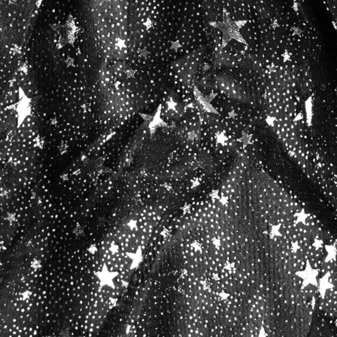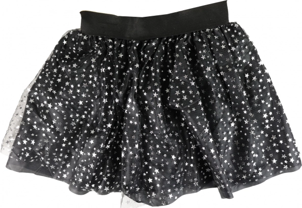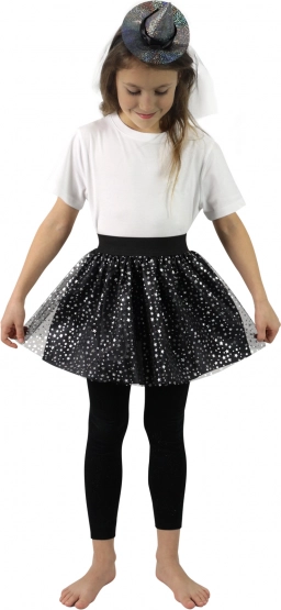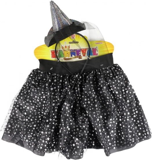 Odličen komplet za vse male modne čarovnice! Krilce ima črno podlogo, prekrito s tilom s potiskom srebrnih zvezdic. Primerno je za deklice, stare od 3 do 7 let. Dolžina krila je 28 cm. Komplet dopolnjuje naglavni trak s klobučkom, ki se odlično ujema s krilcem. Odlično se prilega tudi za noč čarovnic ali pustni karneval!