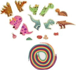 Set vsebuje pet delov z dinozavri in pet vzdržljivih vrvic, ki lepo sedejo v otroško roko. Prepletanje je tiho, varno in primerno za potovanja ter vrtec. Igrača spodbuja logično razmišljanje, vztrajnost in samostojnost.
