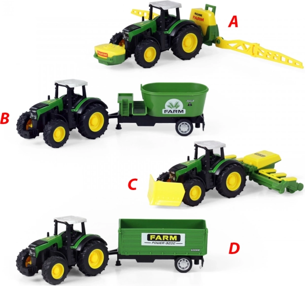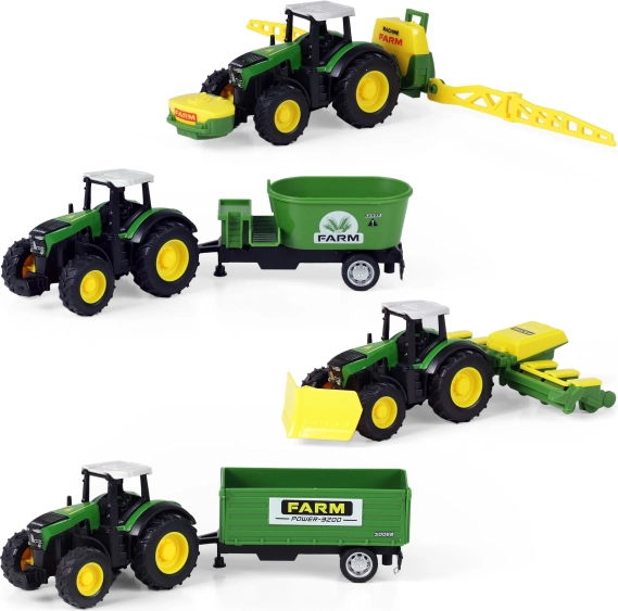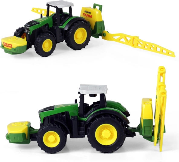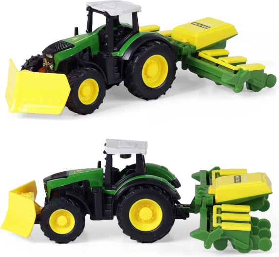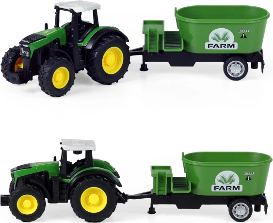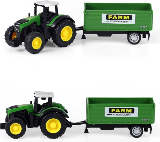 Odkrijte čar kmetovanja s tem modernim traktorjem in njegovo odstranljivo prikolico. Enostavno odstranljiva prikolica vam omogoča fleksibilnost za različne aktivnosti na kmetiji. Traktor je opremljen z vožnjo na vzvratni vztrajnik in meri približno 18 cm skupaj s prikolico. Izberite izmed 4 različnih modelov, ki prepričajo s prefinjenim dizajnom in realističnimi podrobnostmi.