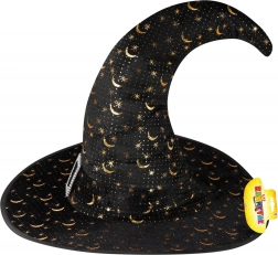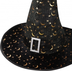 Ustvarite popoln čarovniški kostum s tem elegantnim klobukom v klasični črni barvi. Širok krajec in špičasta oblika zagotavljata avtentičen videz, medtem ko se zlate zvezde in polmeseci lepo bleščijo in poudarijo mistično atmosfero. Okrasna sponka pri osnovi stožca doda celoti pridih šarma.