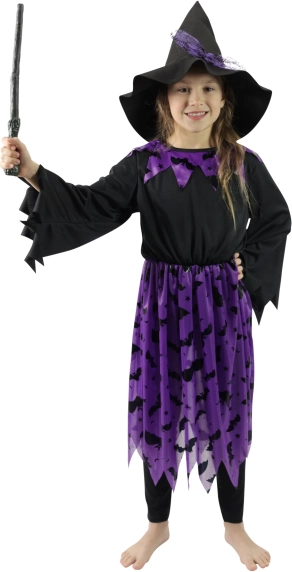 Vpadljiva črno‑vijolična izvedba in dekor netopirjev kostumu dodata pristno čarovniško vzdušje, ki očara na prvi pogled.