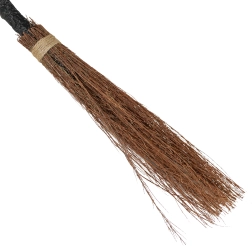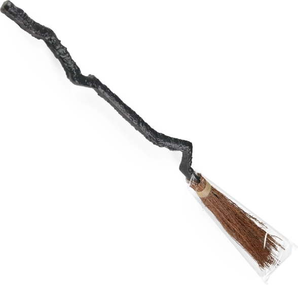 Metla s črnim ročajem in rjavo pometalno površino spominja na klasični čarovniški rekvizit.