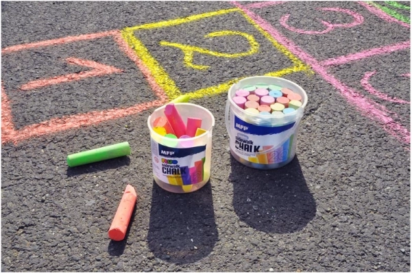 Komplet je odličen za aktivnosti na prostem na pločniku ali igrišču, po zabavi pa ga preprosto operete z vodo. Barvna sestava: 2× rumena, 2× zelena, 4× oranžna, 2× rožnata, 2× vijolična.