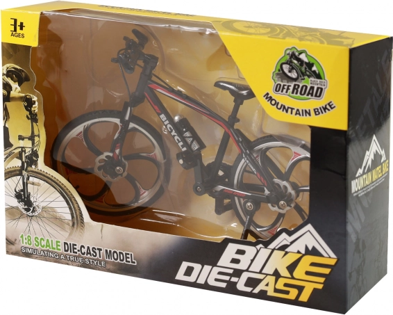 Odkrijte podrobno izdelano mini gorsko kolo v elegantni črni barvi z rdečimi poudarki. Ta kovinski model s prostim tekom koles zvesto posnema pravo kolo – od okvirja in krmila do izrazitih obročev. Odlično darilo za ljubitelje kolesarjenja ali kot dekoracija za mizo oziroma polico.