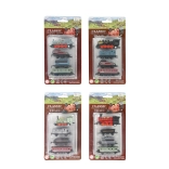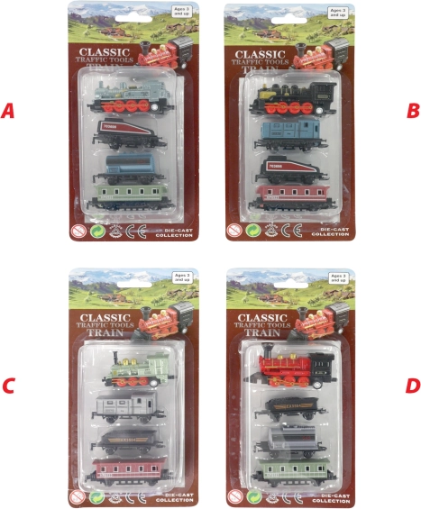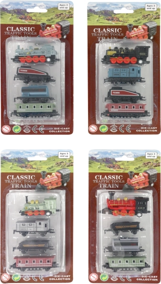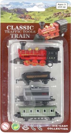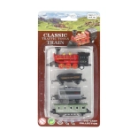 Set vsebuje kovinsko lokomotivo in tri plastične vagone, idealno za male zbiratelje.