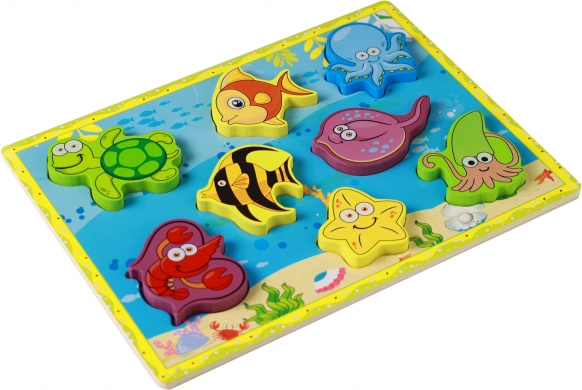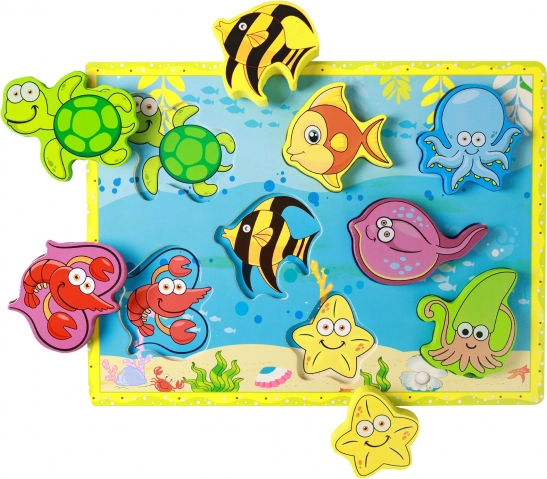 Odkrijte čar podvodnega sveta s to kakovostno leseno vstavljanko za najmlajše. Barvni koščki morskih živalic spodbujajo prepoznavanje oblik in barv, razvijajo fino motoriko ter koordinacijo oko–roka, hkrati pa otrok na zabaven način uri zbranost in logično mišljenje.