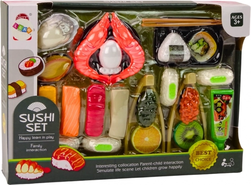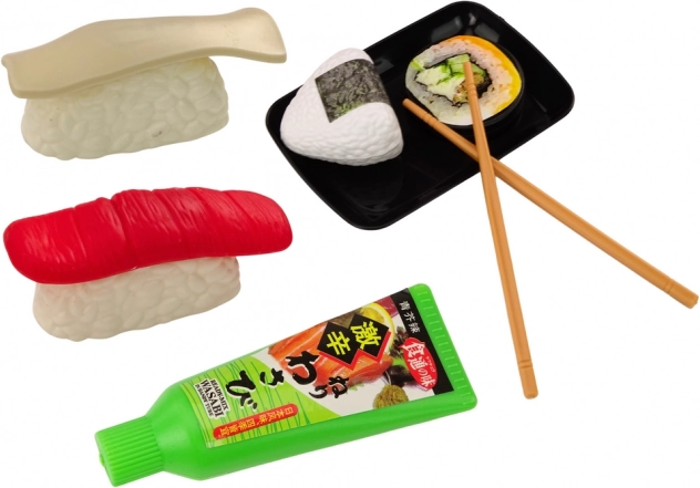 Komplet igrač za otroke, ki najmlajše popelje v čarobni svet priprave in postrežbe okusnega sušija. Set vključuje različne sestavine, potrebne za pripravo slastnega sušija. Med njimi so škampi, losos, wasabi, riž, nori alge in palčke za suši.