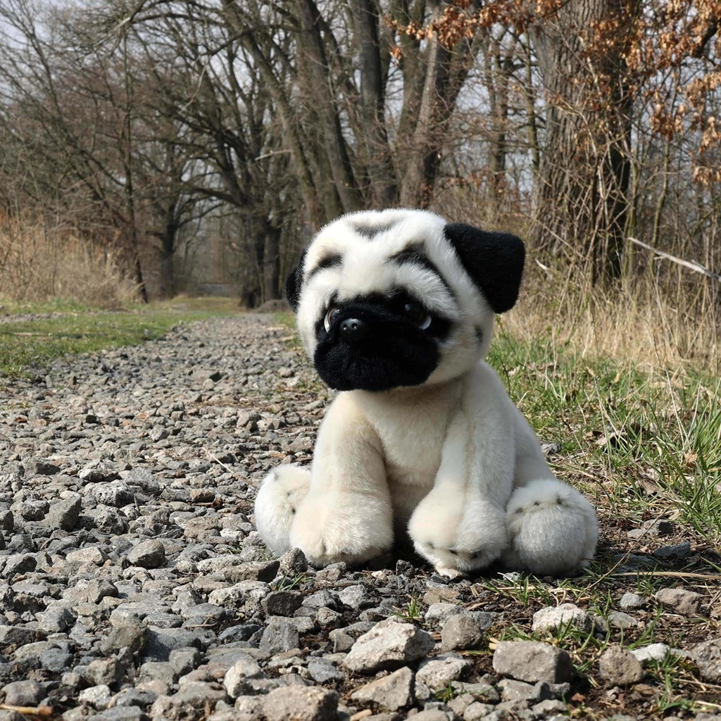 Verodostojna izdelava mopsa s črnimi uhlji in smrčkom, nežna dlaka za največje udobje pri crkljanju.