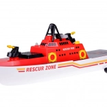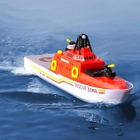 Kombinacija rdečih, belih in rumenih barv skupaj z detajli, kot so vodna topova in antene, prispeva k avtentičnemu videzu reševalnega čolna.