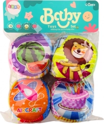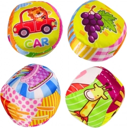 Set 4 mehkih žogic za otroke je izobraževalna in interaktivna igrača, ki združuje učenje in zabavo. Vsaka žogica v kompletu ima edinstvene motive, ki spodbujajo učenje skozi igro. Barvite ilustracije sadja, živalic in sladic pomagajo otrokom prepoznavati različne predmete. Žogica z ilustracijami osnovnih prevoznih sredstev, pri čemer je vsako poimenovano v angleščini, otroke seznanja s tujim jezikom.