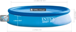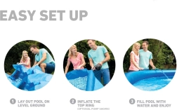 Uživajte v poletju z velikim nadzemnim bazenom s premerom 396 cm in višino 84 cm. Zahvaljujoč hitri namestitvi bo bazen pripravljen za polnjenje v 10 minutah, velik volumen 7.290 l zagotavlja dovolj prostora za osvežitev celotne družine, vzdržljiva konstrukcija z napihljivim zgornjim obročem pa nudi udobje in stabilnost.