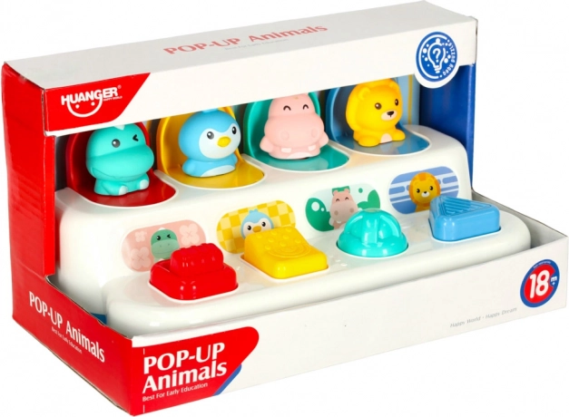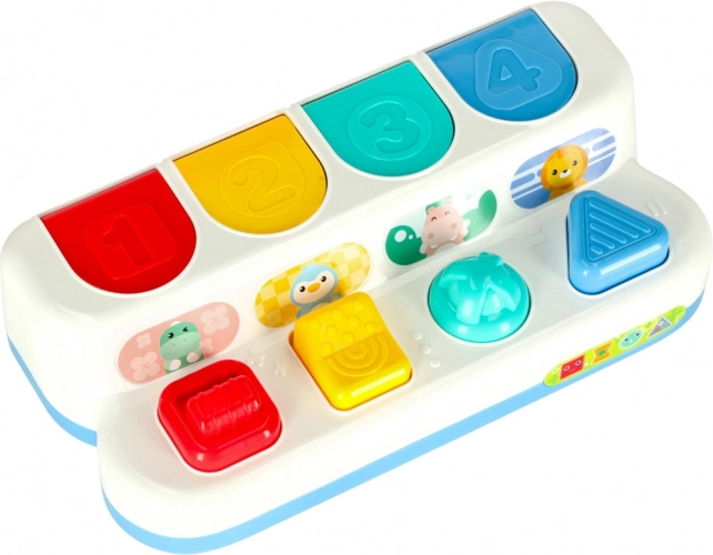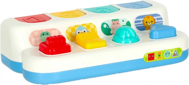 Ta interaktivna pop-up igrača združuje učenje in igro. Otroci odkrivajo barve, oblike in števila, hkrati pa urijo zbranost in logično razmišljanje. Vsaka ploščica ima drugačen mehanizem – pritisk, pomik ali zasuk – in ob pravilnem dejanju poskoči prikupna žival. Značilen »klik« podpira slušno zaznavanje.