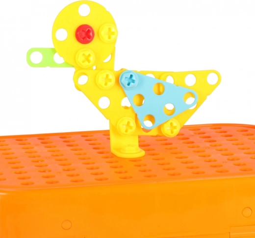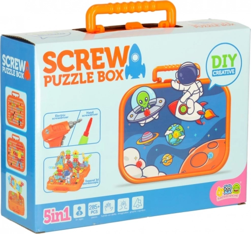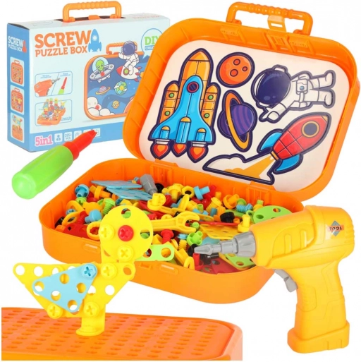 Odkrijte zabavno in izobraževalno igračo za male konstruktorje: prenosna mozaika z električnim vrtalnikom in vijaki. Otroci urijo fino motoriko, kreativnost in logično razmišljanje pri gradnji 2D in 3D modelov z vesoljskimi motivi. Kompakten oranžen kovček služi kot shranjevalni prostor in igralna površina, zato je idealen za na pot.