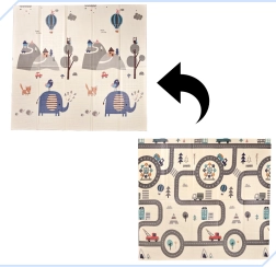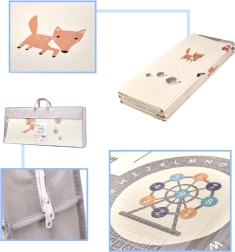 Dizajn podloge spodbuja domišljijo in učenje: na eni strani prikupne živalice in narava, na drugi strani ulice in križišča za ure zabave z avtomobilčki. Podloga se hitro zloži in enostavno prenaša v priloženi torbi z ročajem, ne zavzame veliko prostora, vzdrževanje pa traja le nekaj sekund – dovolj je, da jo obrišete z vlažno krpo.
